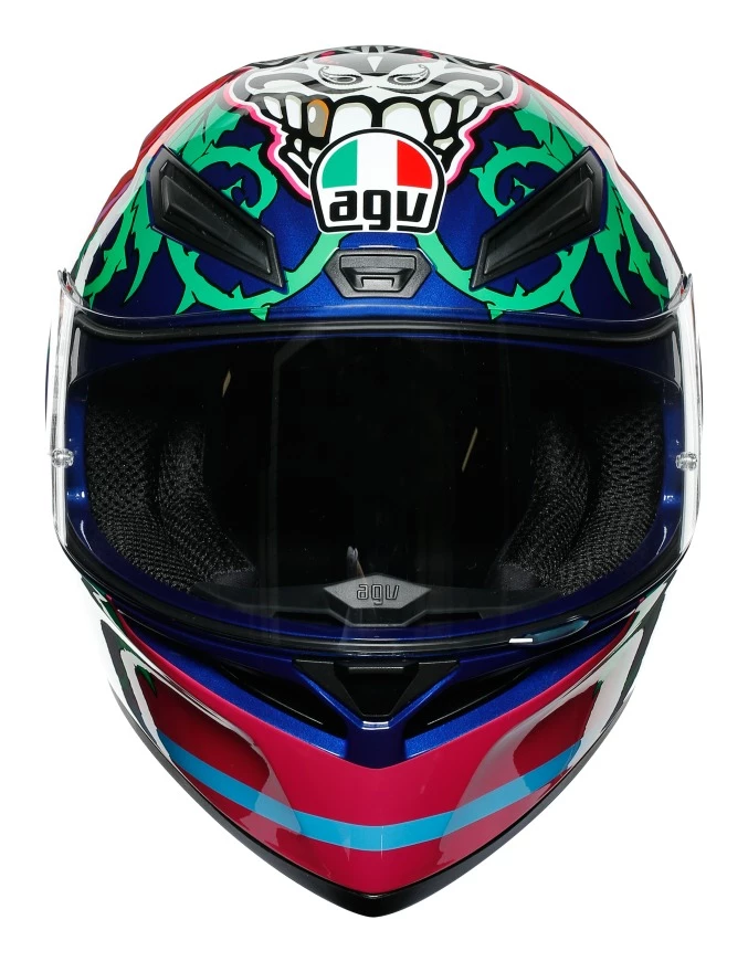 The AGV K1 Salom Helmet has an aerodynamic shape, ventilation scheme, and spoiler developed for the wind tunnel tested Corsa R and Pista GP R. The shell and spoiler provide aerodynamic stability at speed and the spoiler itself features a passive rear vent to extract warm air from the helmet as you ride. The K1 also incorporates the central air intake above the visor taken directly from MotoGP developed Pista GP R to provide best-in-class ventilation.
