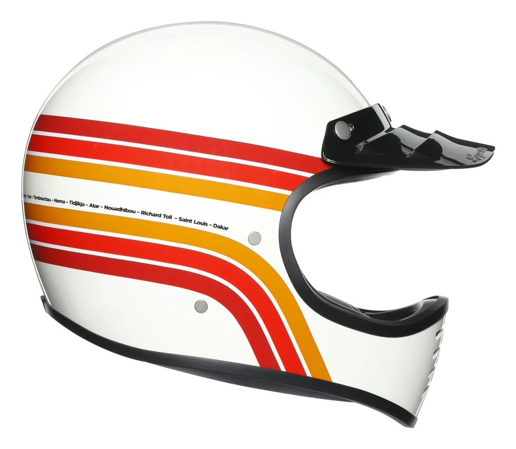 Relive the 70’s with the style that dominated adventure riding, the AGV X101 Dakar 87 Helmet. A fiberglass constructed shell protects riders on the outside while the suede fabric interior keeps heads comfortable. The chin guard air vent was constructed to include a metal grill preventing dirt and debris from entering the helmet while cool air flows through. This goggle ready helmet also features a removable peak and fully removable cheek pads and helmet liner that are machine washable.