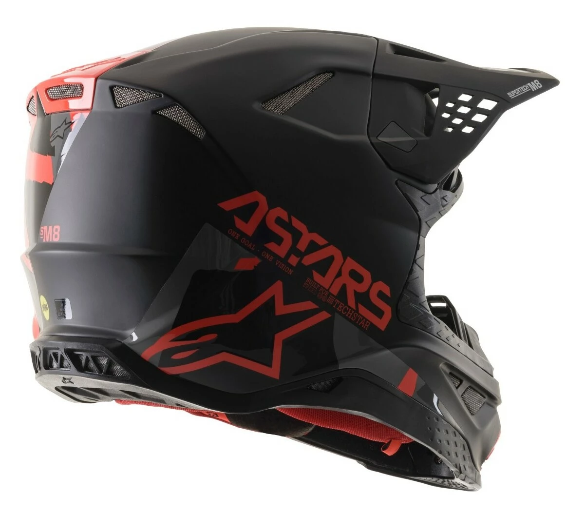 Years of experience designing and manufacturing innovative motorsports technology has given Alpinestars a mastery in outfitting racers, drivers and riders of all types. The Alpinestars Supertech M8 helmet was built from the ground up to be comfortable and protective while still offering high levels of performance for off-road riding and motocross. The Supertech M8 Helmet is constructed of a multi-composite shell and multi-density EPS polymer for for keeping impact energy from reaching your head. Multi-directional Impact Protection System (MIPS) reduces slow glancing rotational impact energy that commonly causes concussions on off-road rides. Emergency release cheek pads along with the “Eject” inflation system allow for emergency removal of the helmet with less stress and movement on the spine.