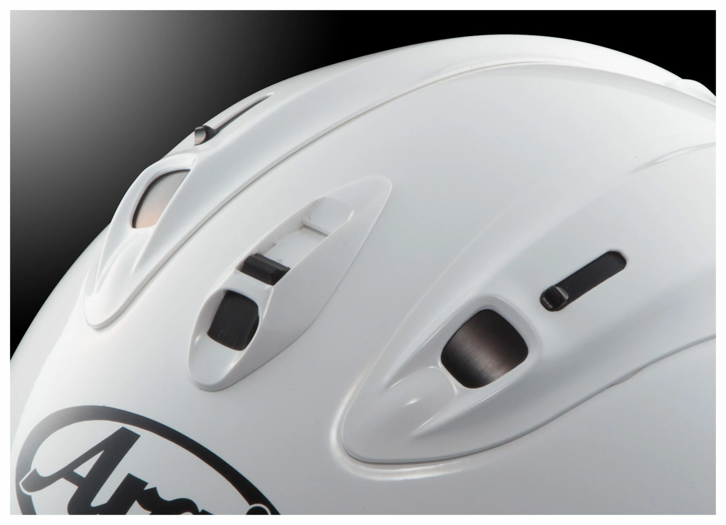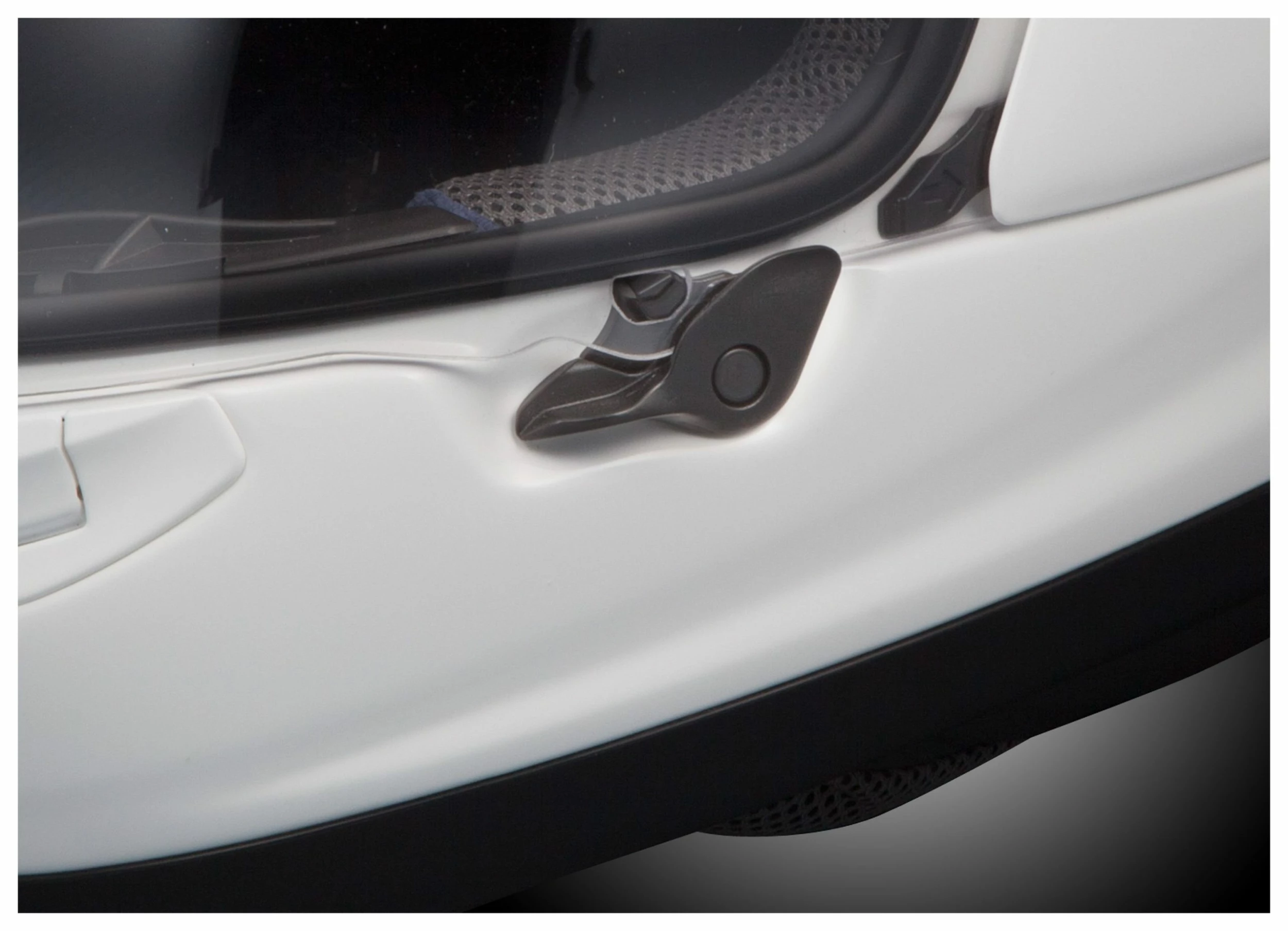 In true Arai fashion, the Corsair-X Helmet has taken helmet technology and rider protection one step further by engineering a helmet that not only guards against direct impacts, but is specifically designed to minimize the effect of “glancing off” impacts as well. Arai has created a stronger shell and smoother shape that is more likely to redirect impact energy than absorb it (therefore decreasing the amount of force transferred to the body). To increase this potential to glance off impact energy, the VAS (Variable Axis System) side pod, pivot cover is smaller in size and its position on the shell is lower.