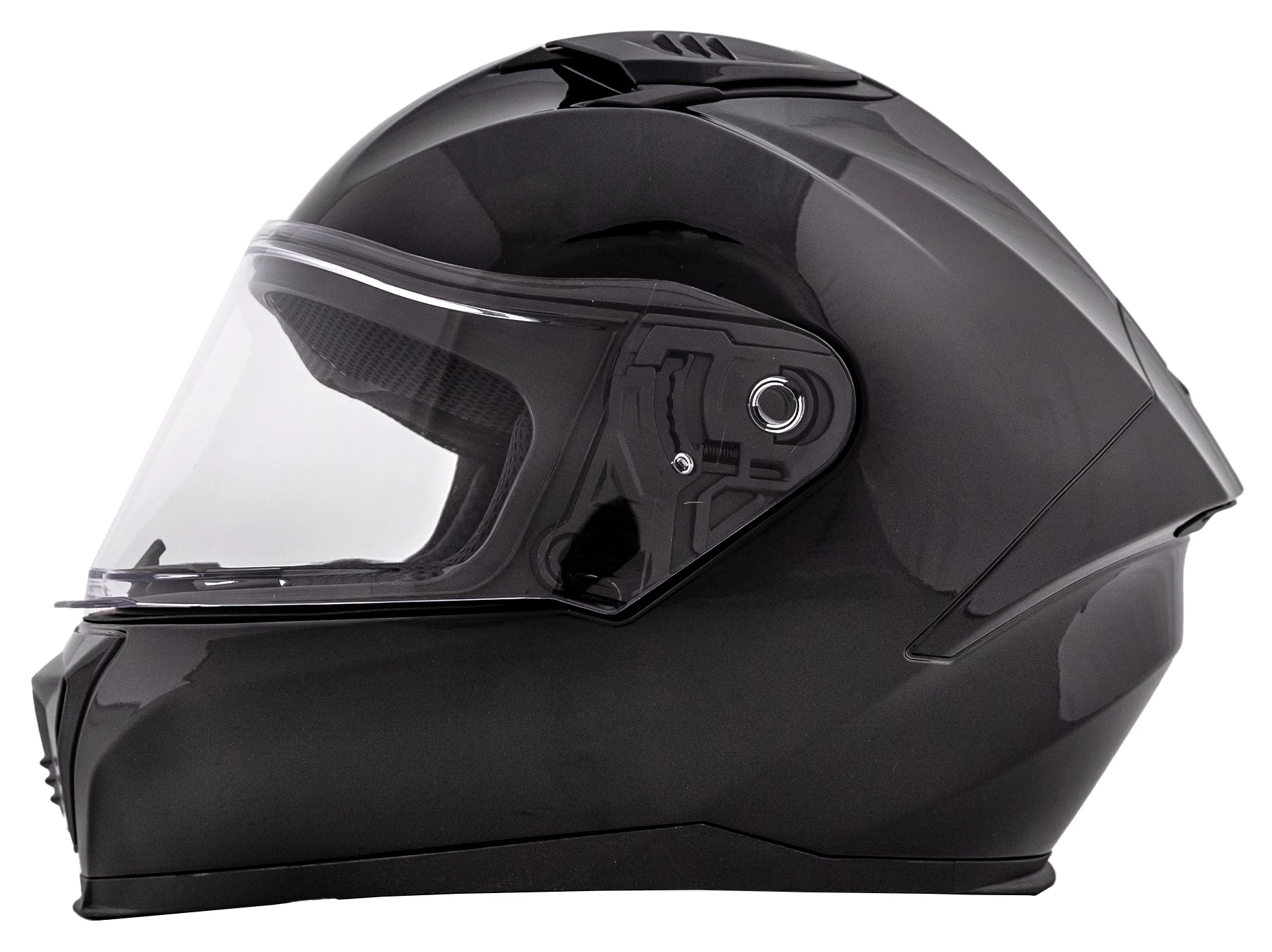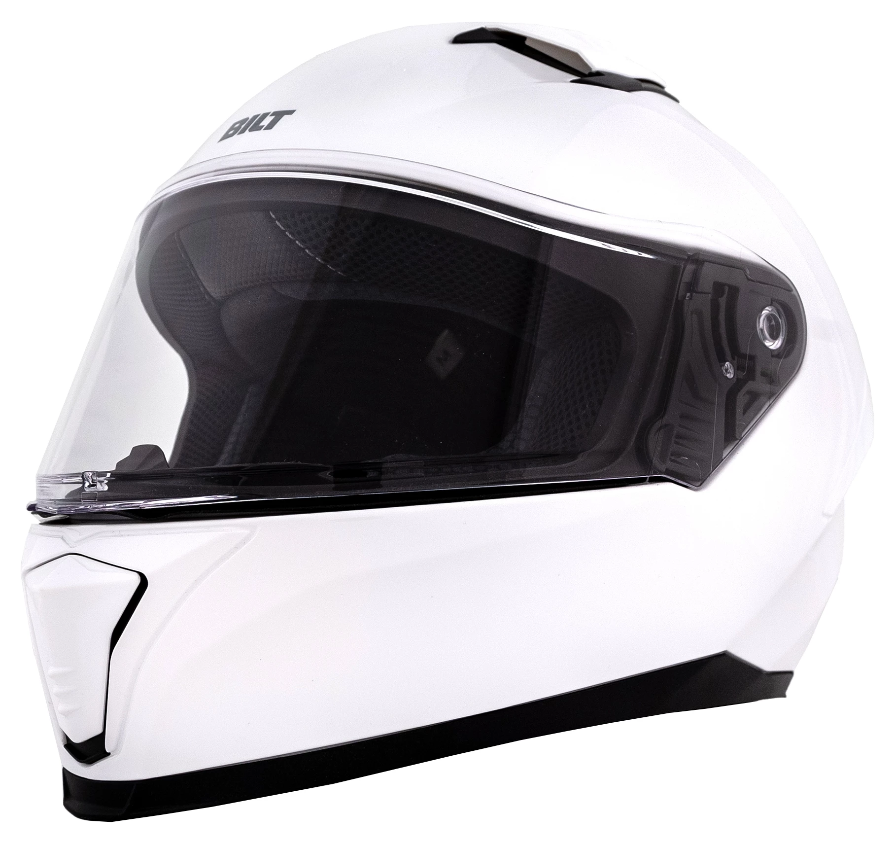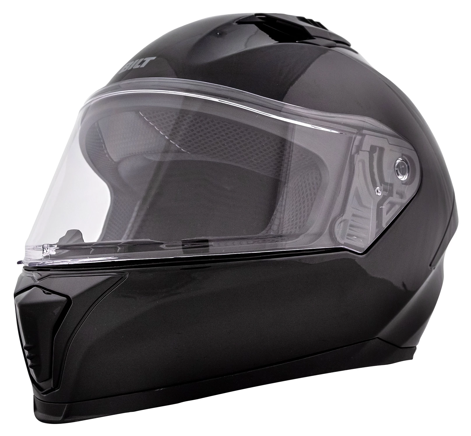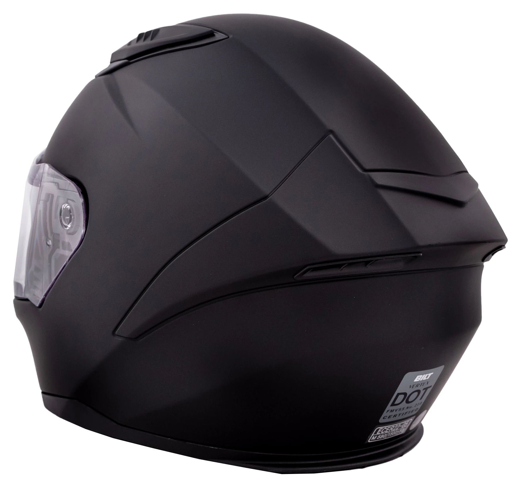 The Vertex from BILT is a fully featured, full face injection-molded polycarbonate helmet that finds itself most at home in the tuck. Sport focused riders will appreciate its aggressive shape and recessed dual top / exhaust vents that pull air through the channeled EPS foam and liner. Adding to its solid base, this helmet features a quick release sprung face shield, double d-ring fasteners, eyeglass compatible cheek pads and built-in speaker pockets as well as ECE / DOT approval.