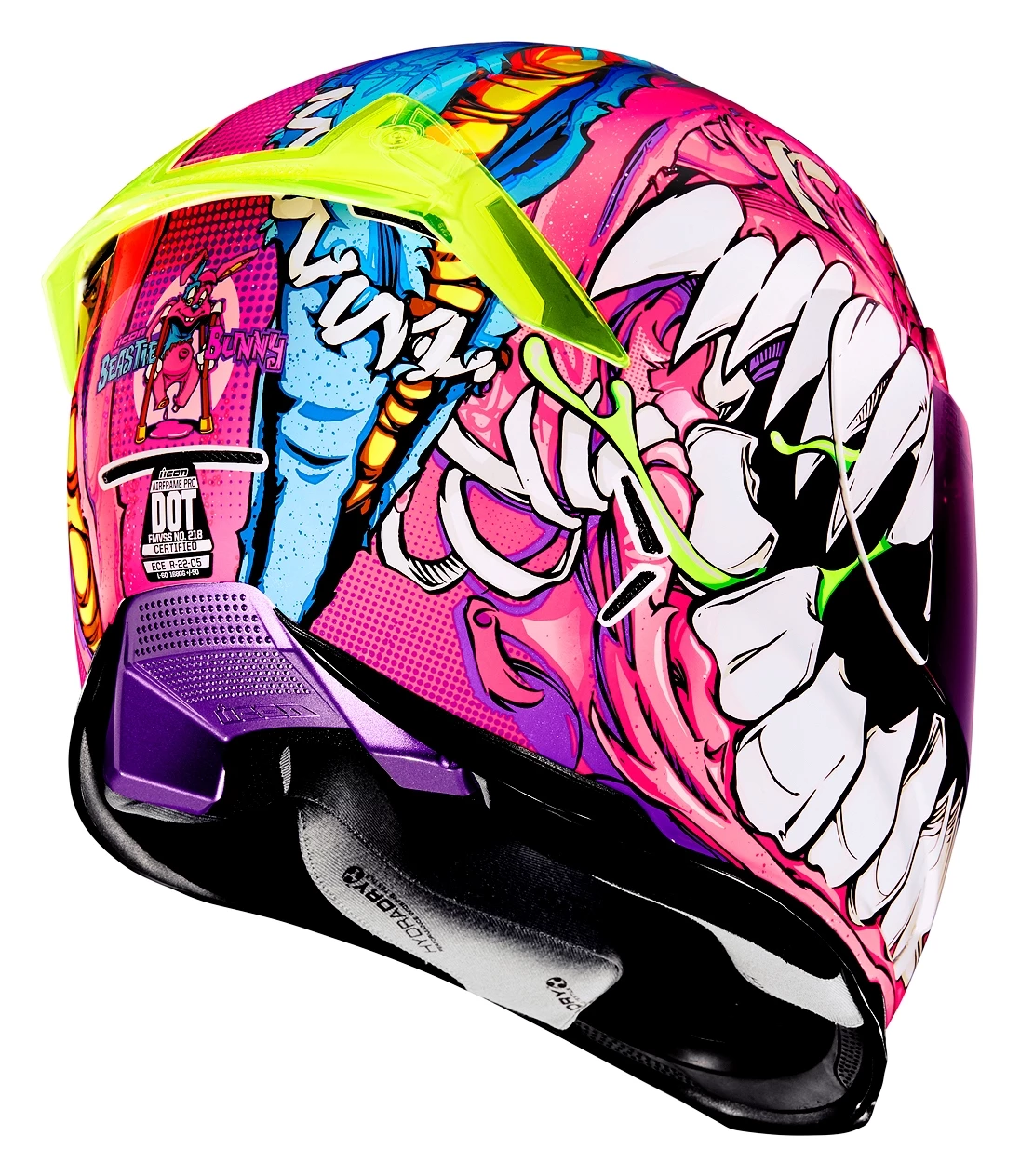 The modern riding position of higher rear sets and lower clip-ons has dramatically altered how a rider interacts with the modern motorcycle. Compressed into an ever more compact shape, the rider’s head positioning requires an increased angle to maintain visibility and stability. The Icon Airframe Pro Helmet has been built on this singular design focus which allows Icon to realize opportunities to decrease drag and weight by sculpting the traditional neckline to avoid jacket or suit interference. The Icon Airframe Helmet’s aggressive geometry increases the line of sight while improving aerodynamic attitude in a fully-tucked riding posture.