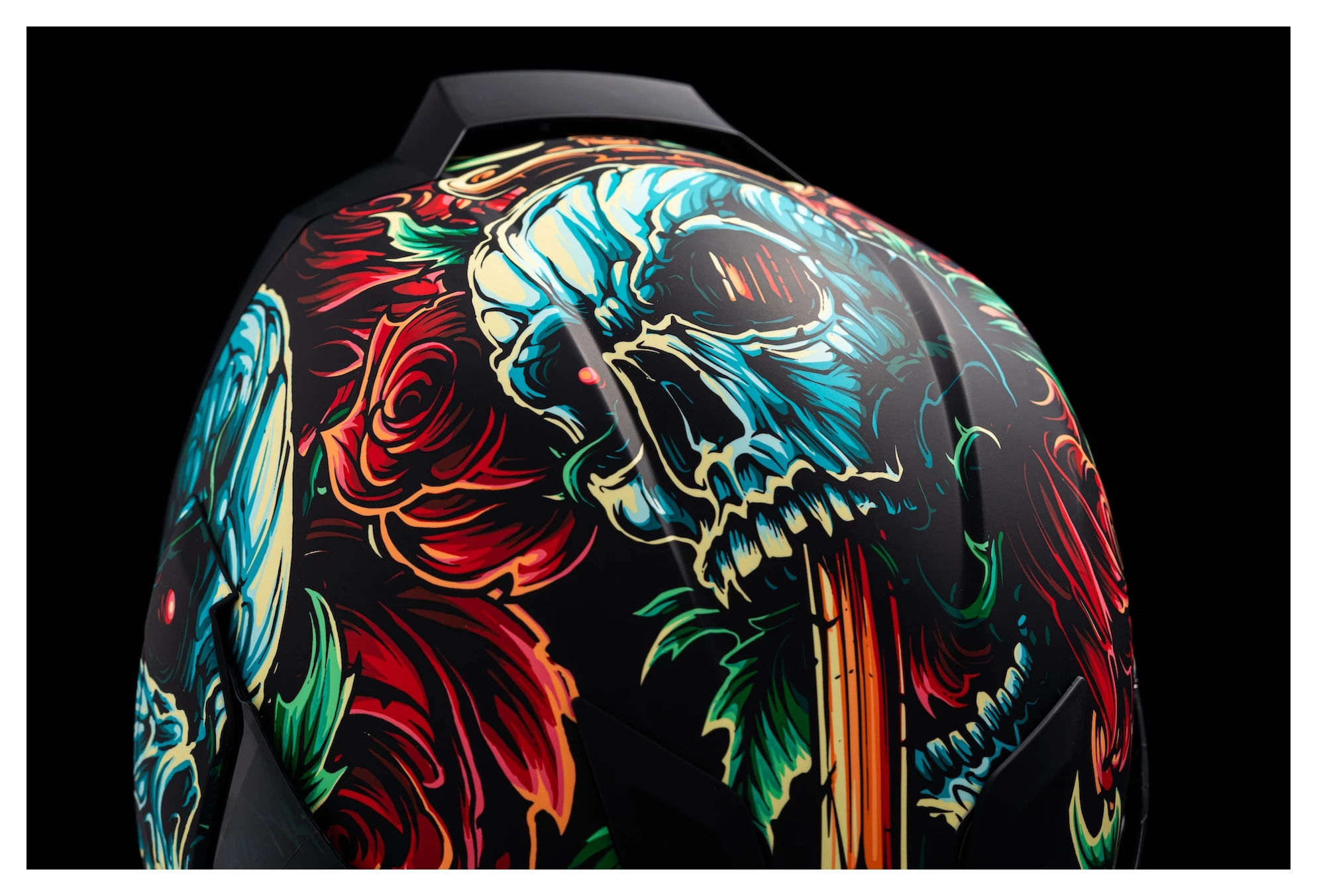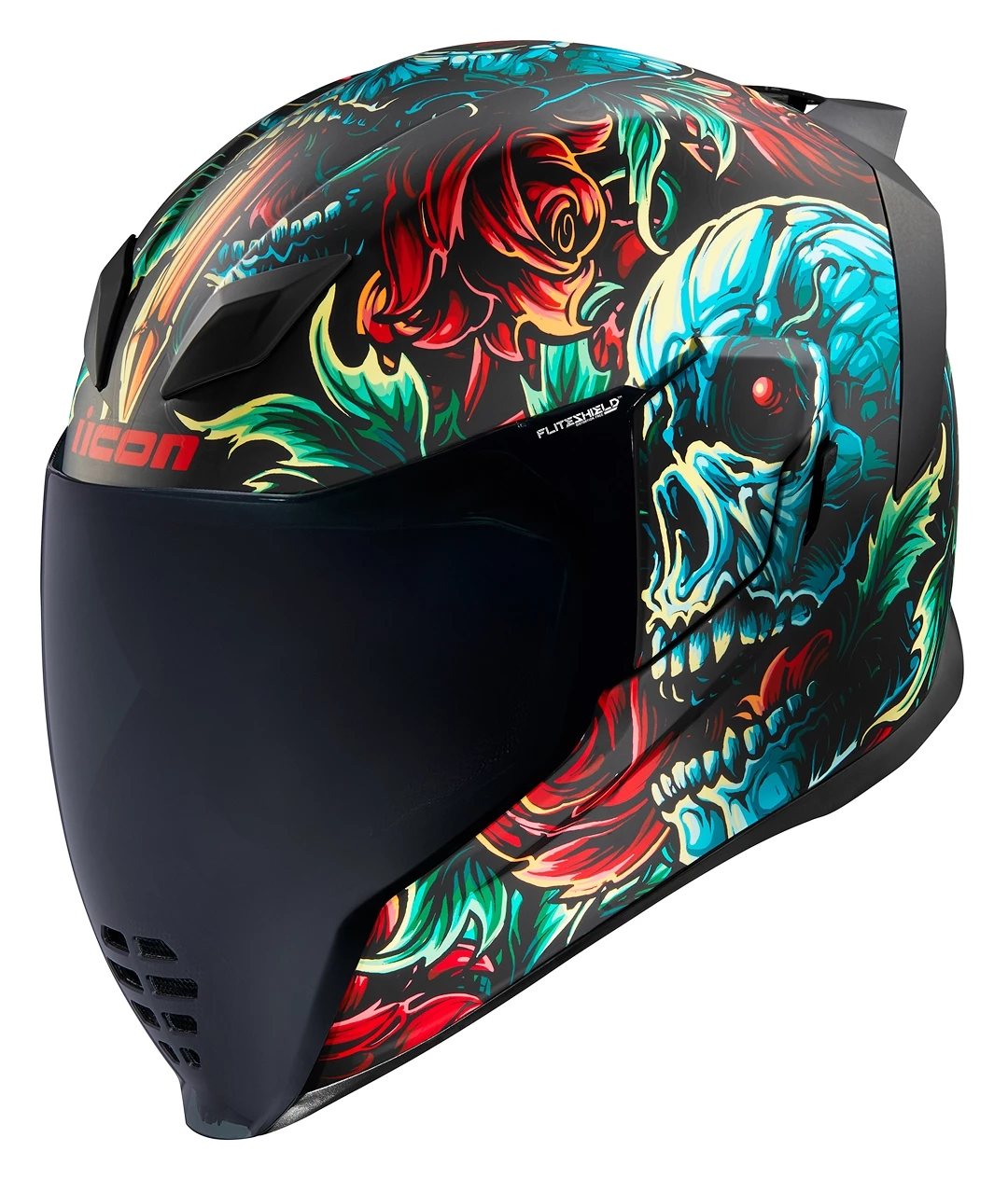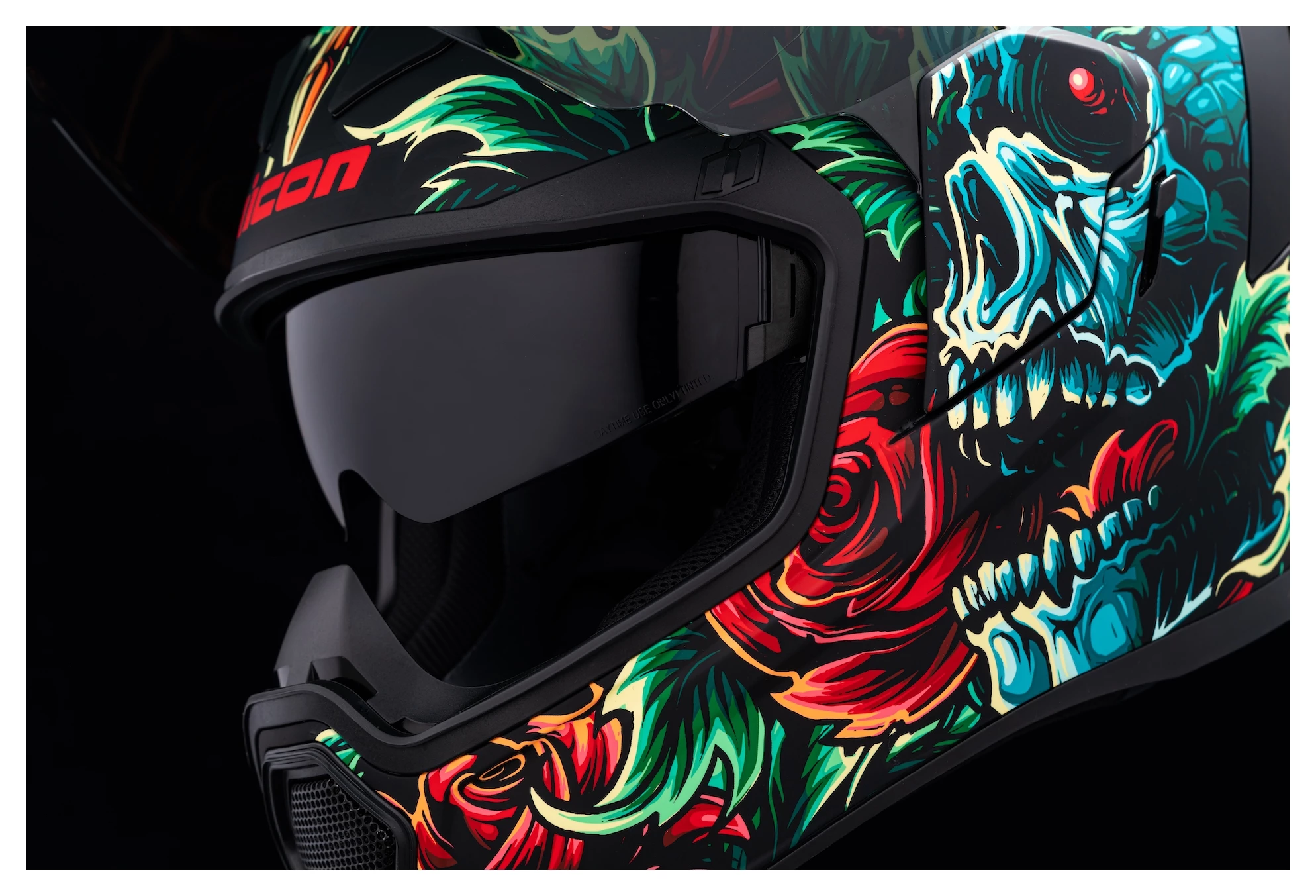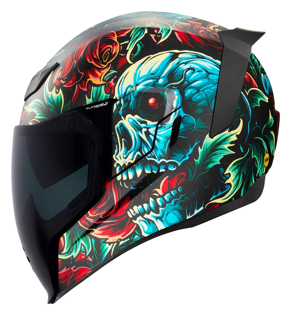 The exterior features Icon’s unique matte Rubatone finish with gothic skull and rose graphics, while the new Forceshield enables a clear line of sight. The injection molded polycarbonate shell is strong to absorb energy and remain intact just in case you unintentionally headbutt something solid. Inside, the Airflite MIPS features the latest rotational-reduction system from MIPS. A drop down internal sun visor allows you to manage the sun or go to incognito mode at the flip of a switch. Removable Hydradry liner wicks moisture to keep your noggin dry and comfortable.