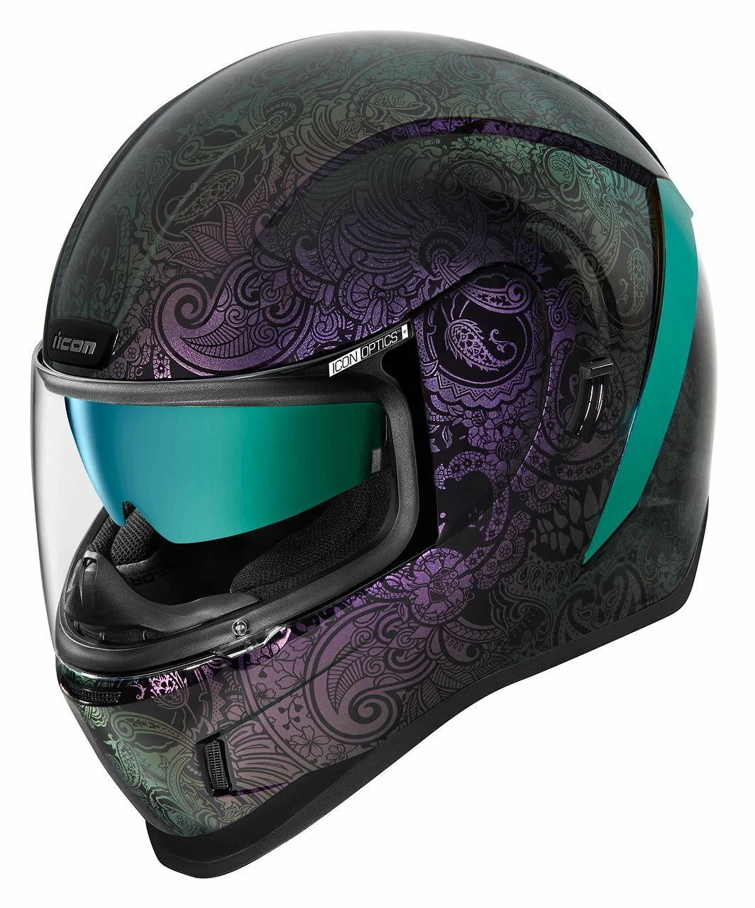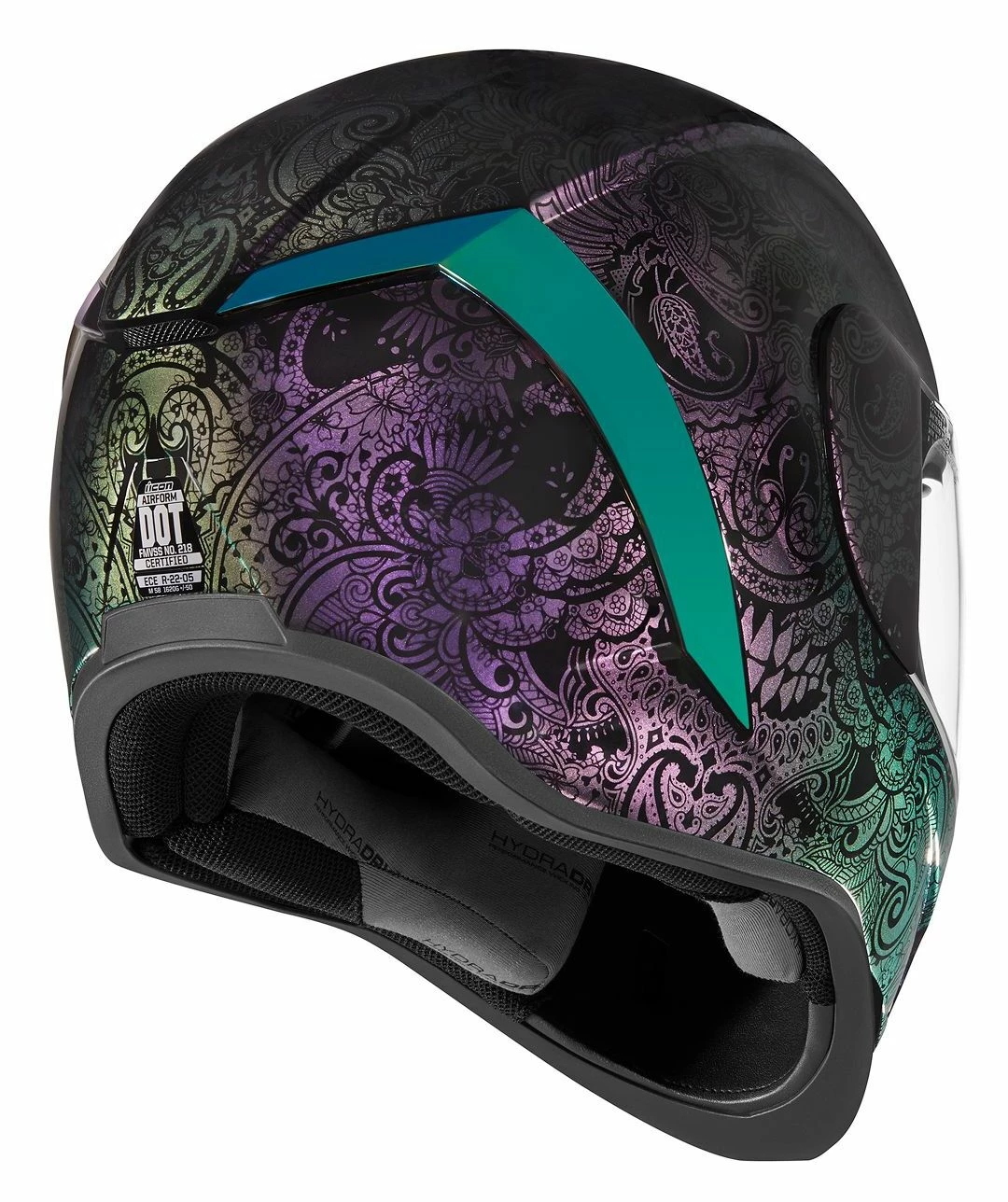 The Chantilly Opal version of the Icon Airform Helmet includes color-matched RST rear spoilers and a matching drop down internal sun visor. Very stunning.