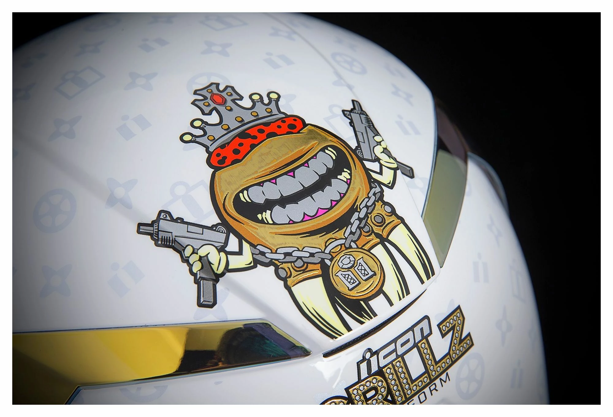 The Grillz version of the Icon Airform includes a clear and dark smoke Icon Optics face shield. RST gold rear side spoilers arrive installed. The Grillz Helmet also has a unique 3D texture added to the jewel images.