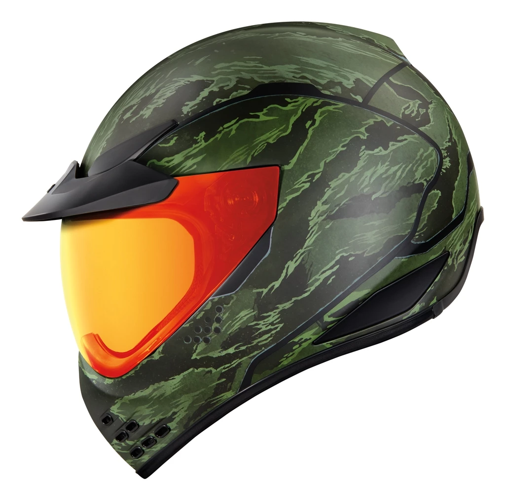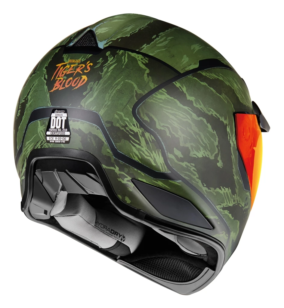 The Icon Domain Helmet features a hand-crafted FRP shell for maximum integrity with minimal weight. A prominent dorsal ridge, large brow-mounted intake vents and channeled EPS provide increased ventilation. This increased ventilation greatly enhances rider comfort when paired with the removable Hydradry liner and removable chin curtain. The Domain is also compatible with ICON’s HelmLink Bluetooth communications system, which seamlessly integrates with the helmet (sold separately).